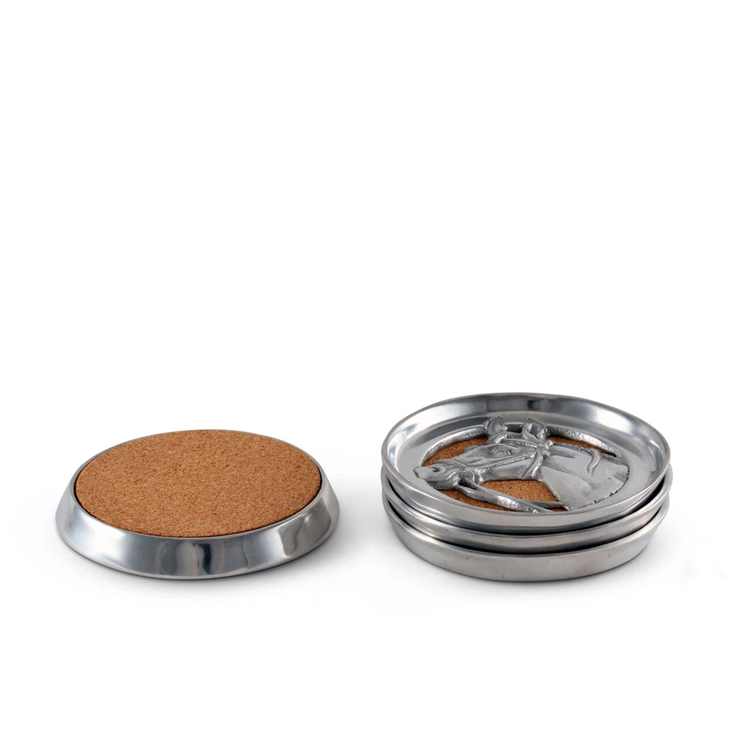 Arthur Court’s Equestrian Drink Coasters are sold in a set of four. Hand-crafted in our proprietary aluminum alloy, the round, rimmed coasters feature a detailed visage of a bridled Thoroughbred in bas- relief.