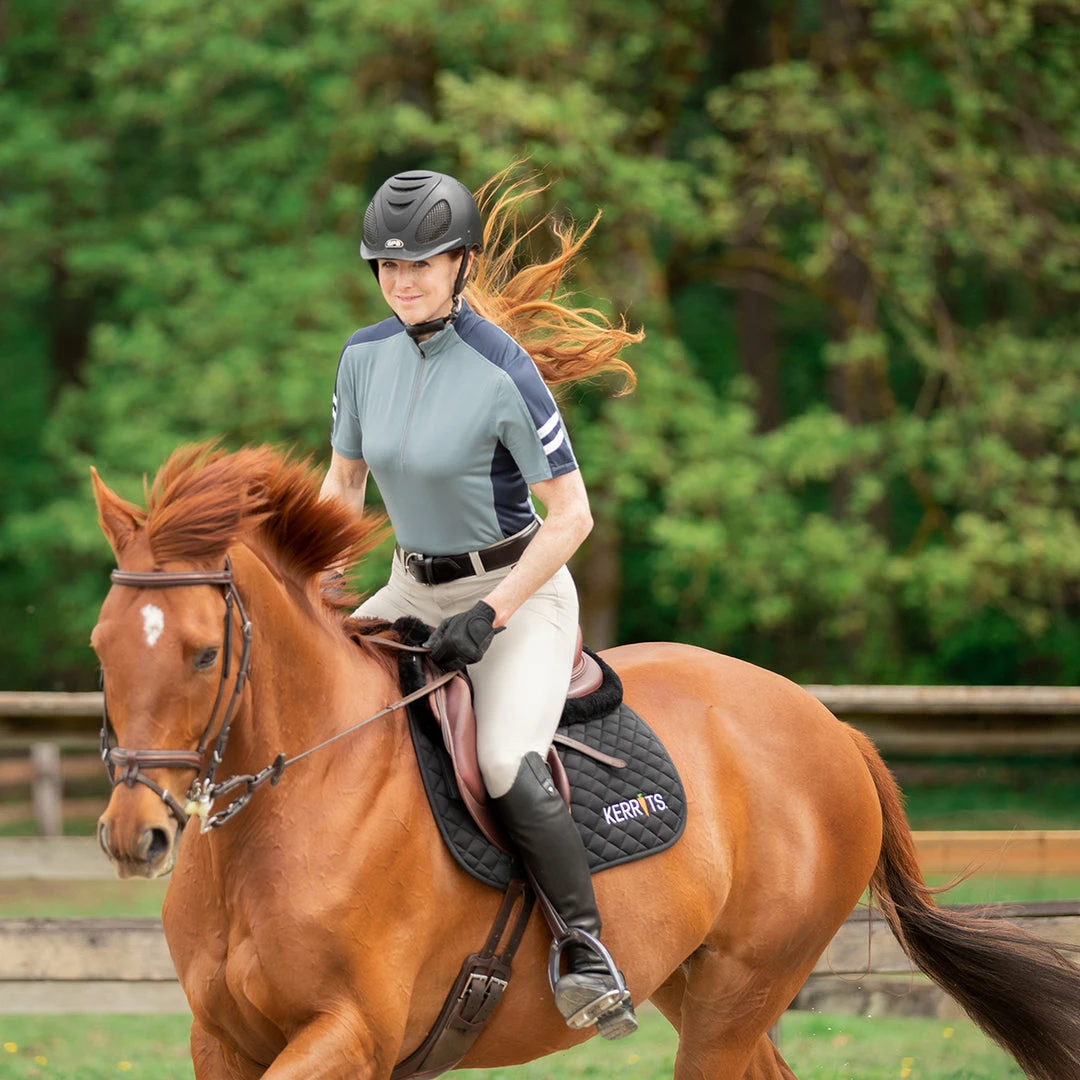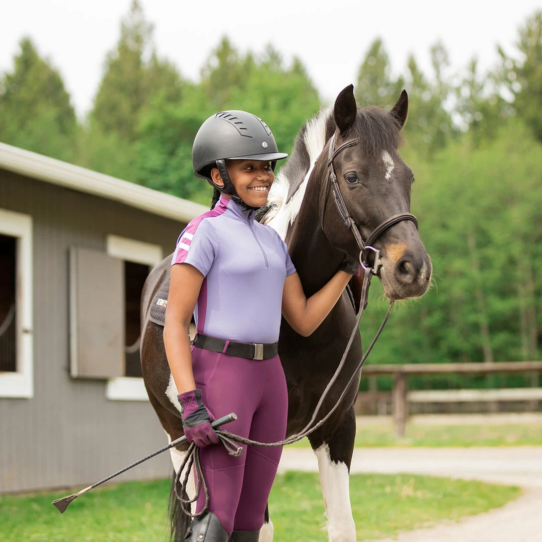 Kids will adore the fun horse and floral prints which also help hide dirt. Hi-tech Ice Fil® fabric cools their skin temperature, but never their enthusiasm for all things equine. High collar and UPF+30 sun protection blocks harmful rays. Eight-inch zip for additional ventilation.