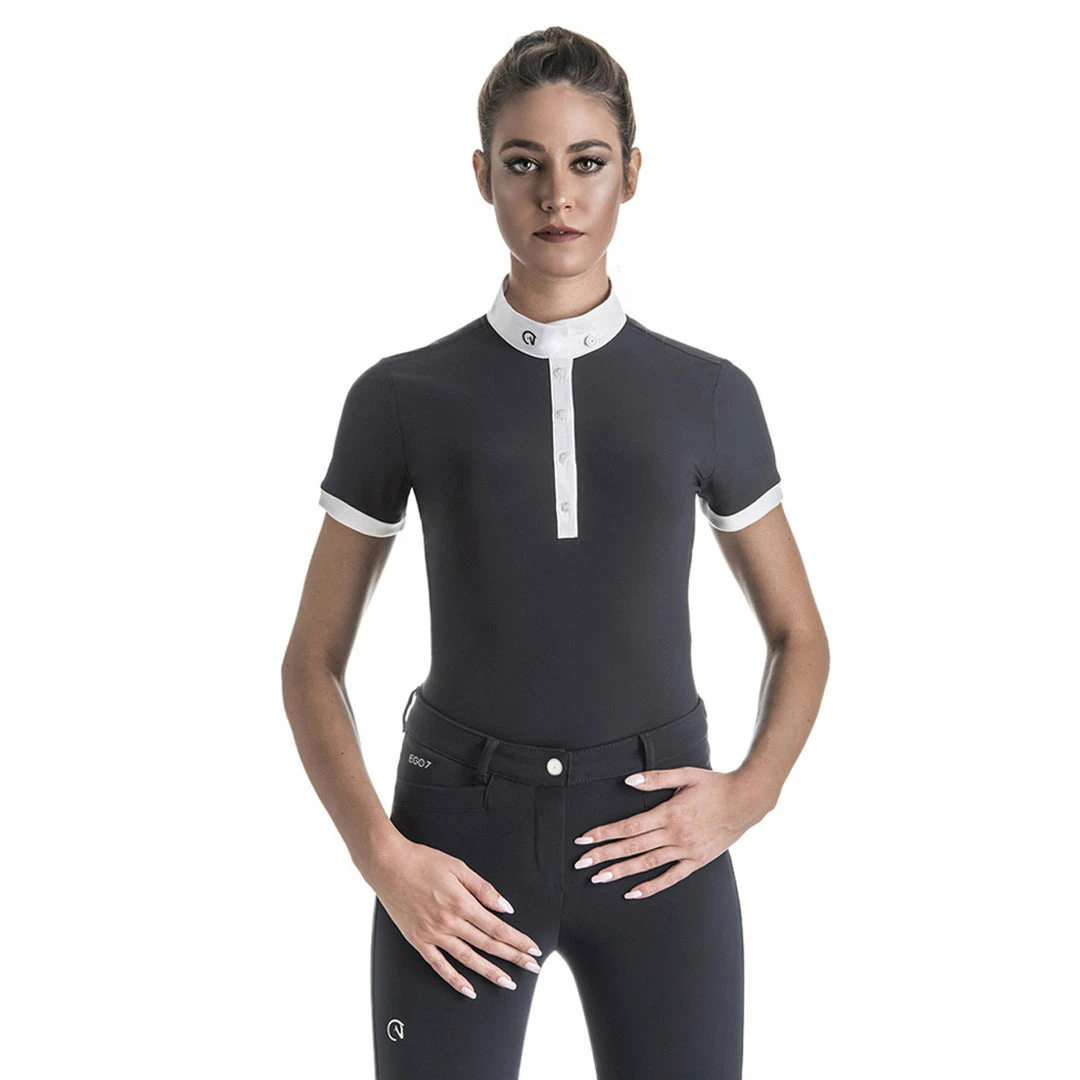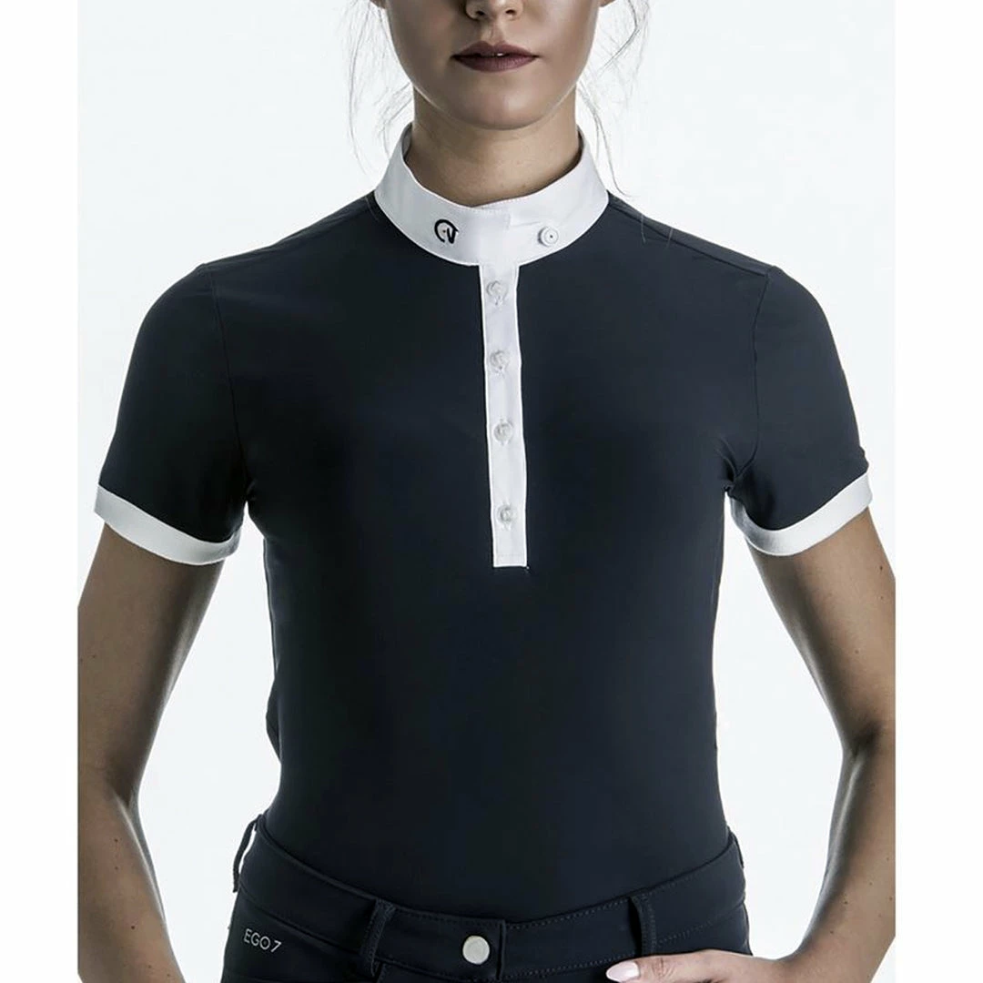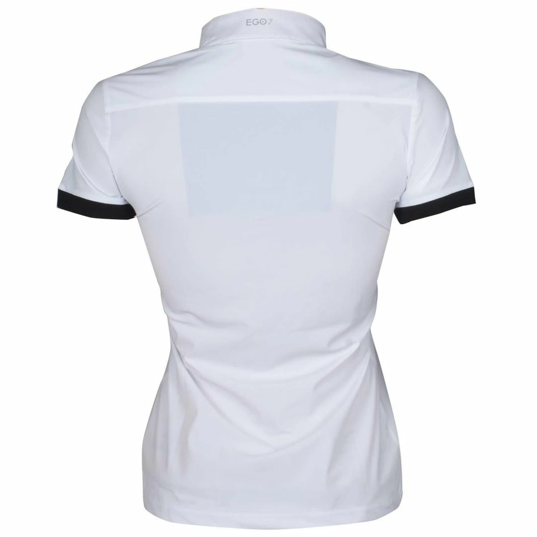 Classic yet modern, the EGO7 Short Sleeve Polo Top goes beyond traditional equestrian style with impeccable Italian design. Revolutionary technical performance fabric offers all the advanced features to keep you riding at your best, in a cut designed to ensure a great fit. This easy-care ladies polo is exceptionally comfortable and breathable. It wicks moisture, dries quickly, provides UV ray protection and maximum stretch for your freedom of movement. Antibacterial properties help control odor. Beautiful details, such as a fancy buttoned collar and contrasting short sleeve trim, give it a distinctive look.