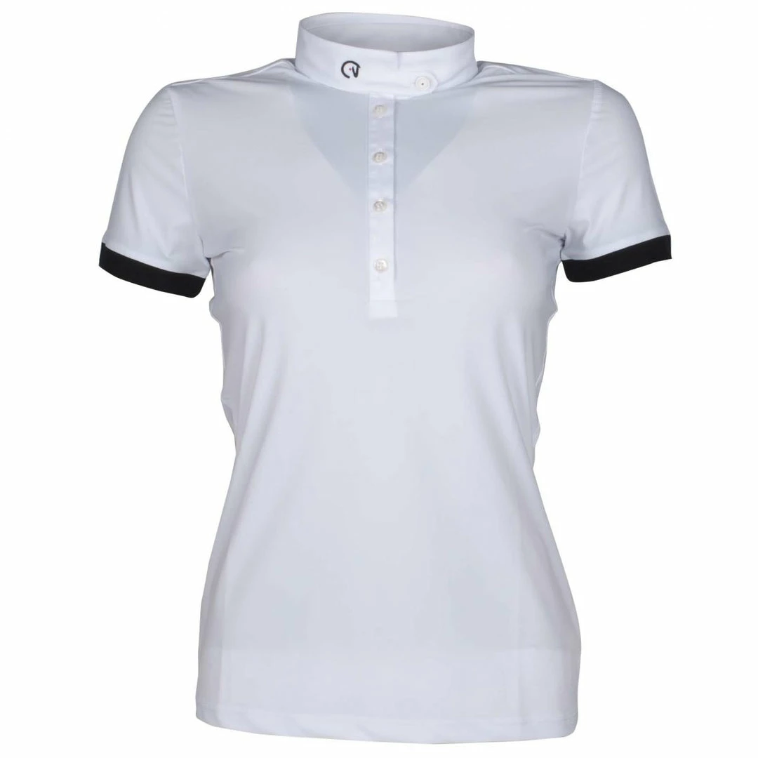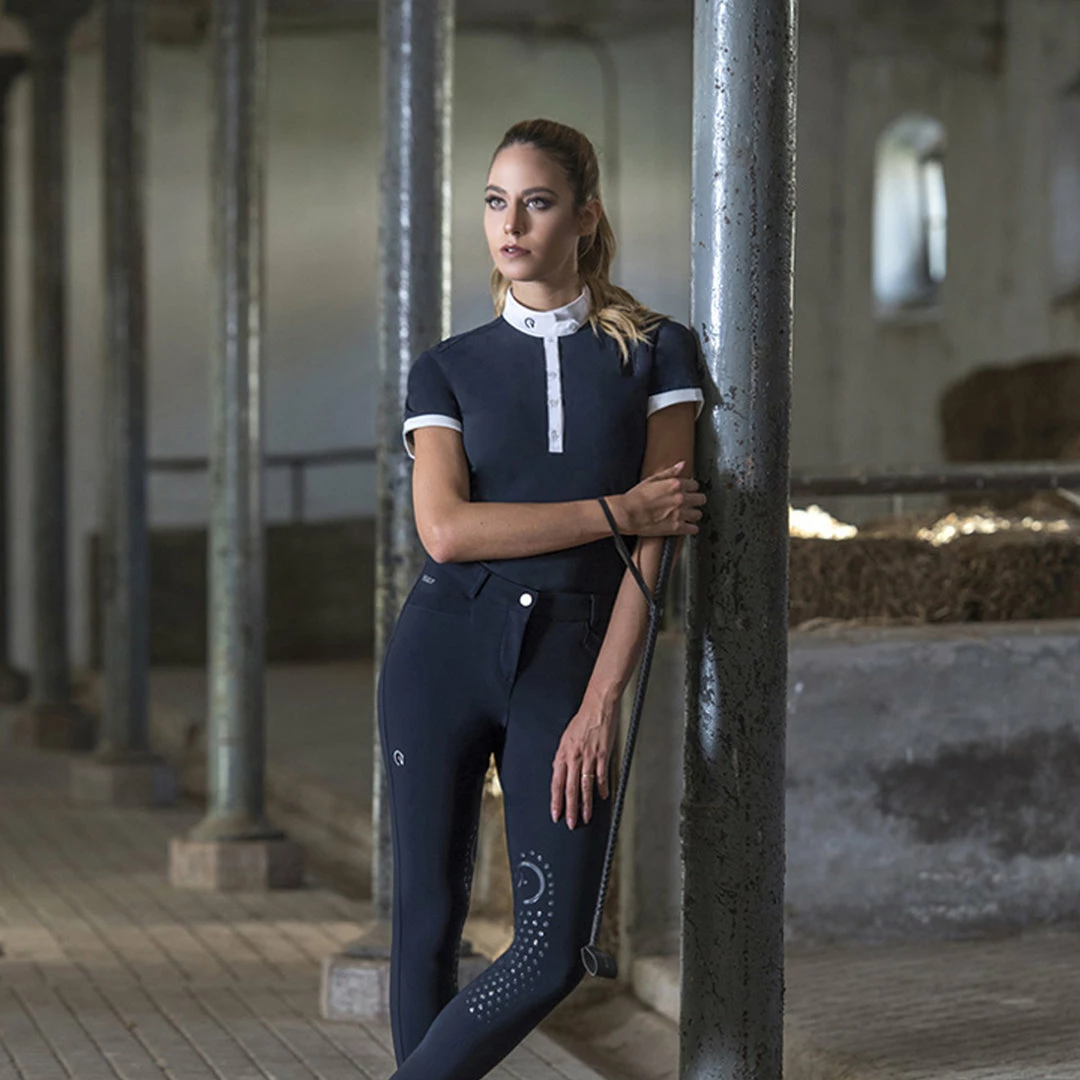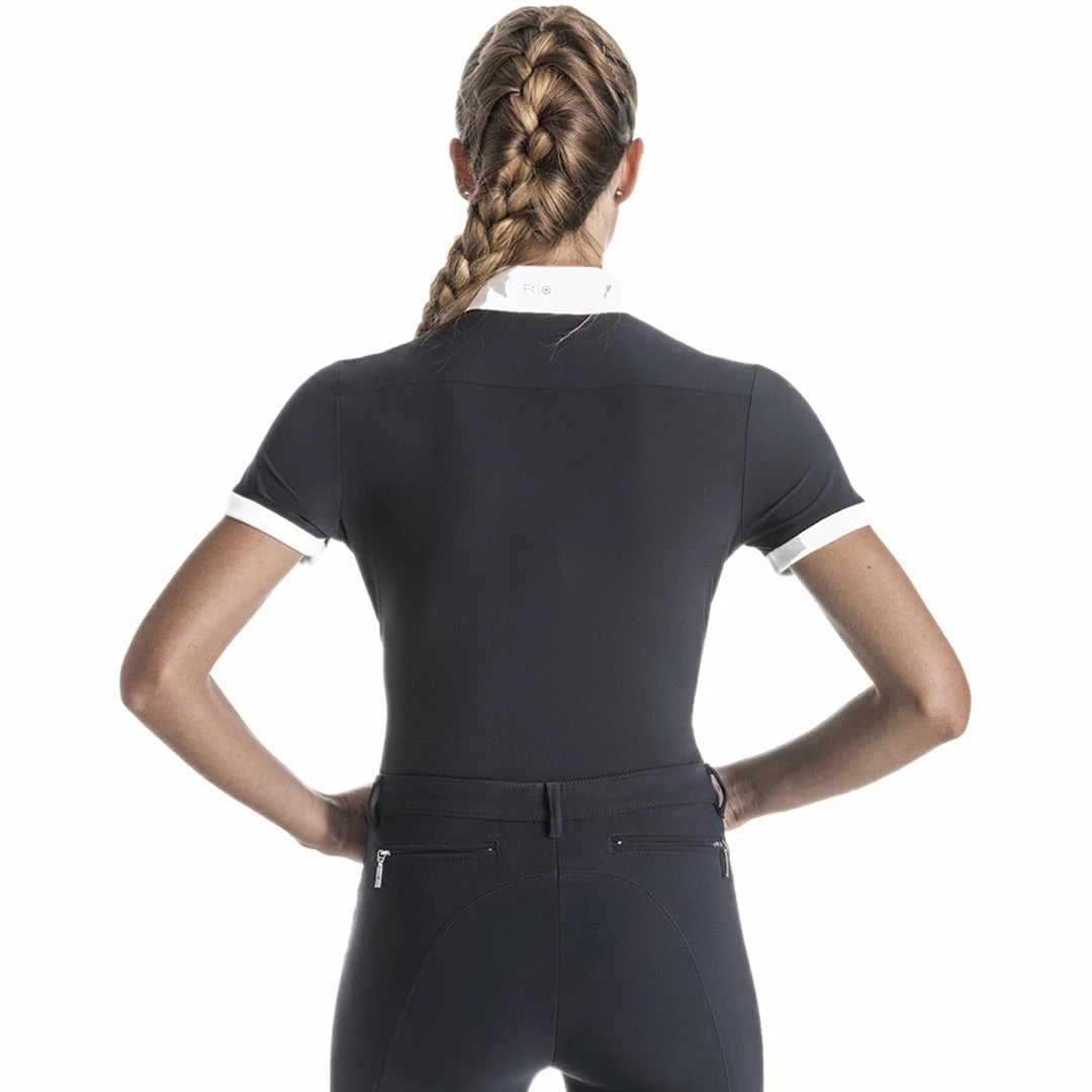 Classic yet modern, the EGO7 Short Sleeve Polo Top goes beyond traditional equestrian style with impeccable Italian design. Revolutionary technical performance fabric offers all the advanced features to keep you riding at your best, in a cut designed to ensure a great fit. This easy-care ladies polo is exceptionally comfortable and breathable. It wicks moisture, dries quickly, provides UV ray protection and maximum stretch for your freedom of movement. Antibacterial properties help control odor. Beautiful details, such as a fancy buttoned collar and contrasting short sleeve trim, give it a distinctive look.