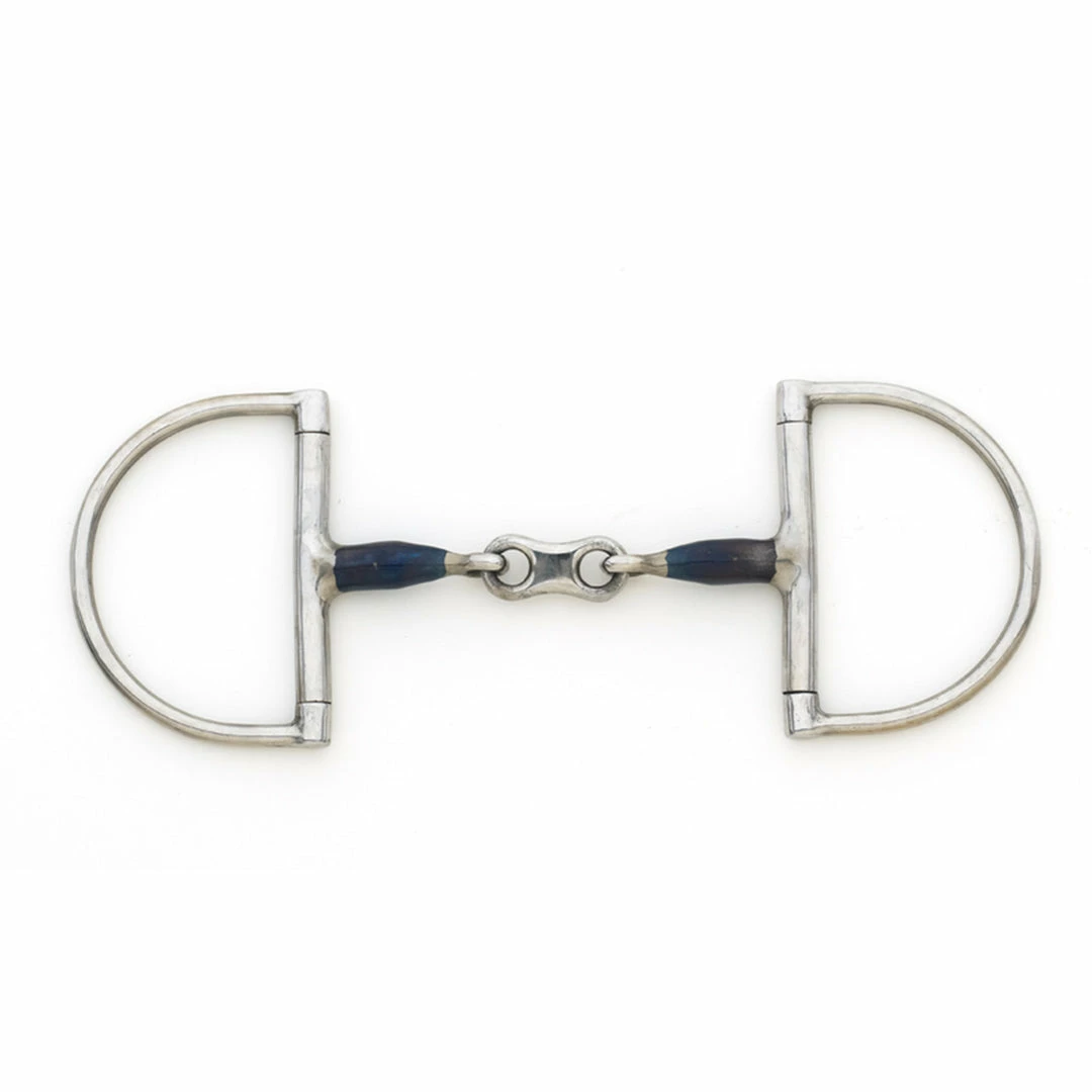 We love this Centaur® Blue Steel French Link Hunter Dee Bit because it is a mild bit with a bit more control. The french link adds pressure to the tongue and stops the nutcracker action of regular snaffle bits, giving more control. This is a classic bit popular in the hunter ring. Â