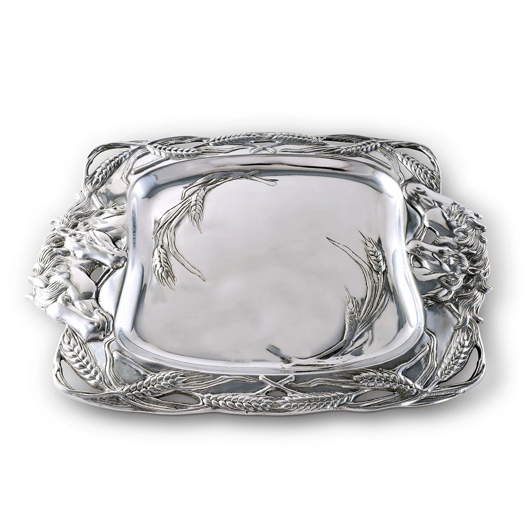 Groups of stallions mingle on either side of this handmade, aluminum dish as stalks of wheat form an openwork border around them. The incredible definition and detail within each design is both tangible and visible.