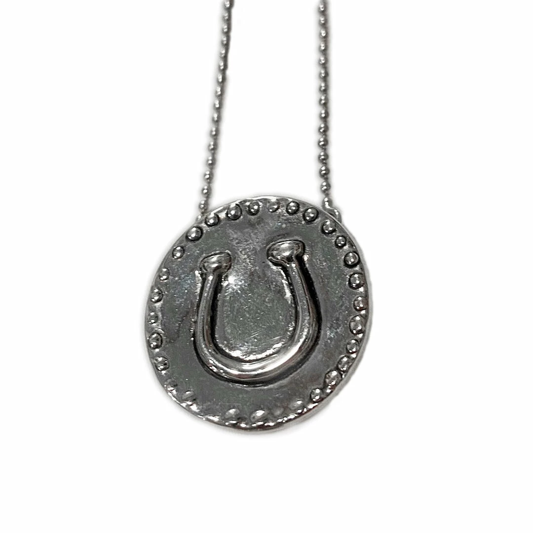Sterling silver pendant with stamped horseshoe on a beaded chain. Made in USA.