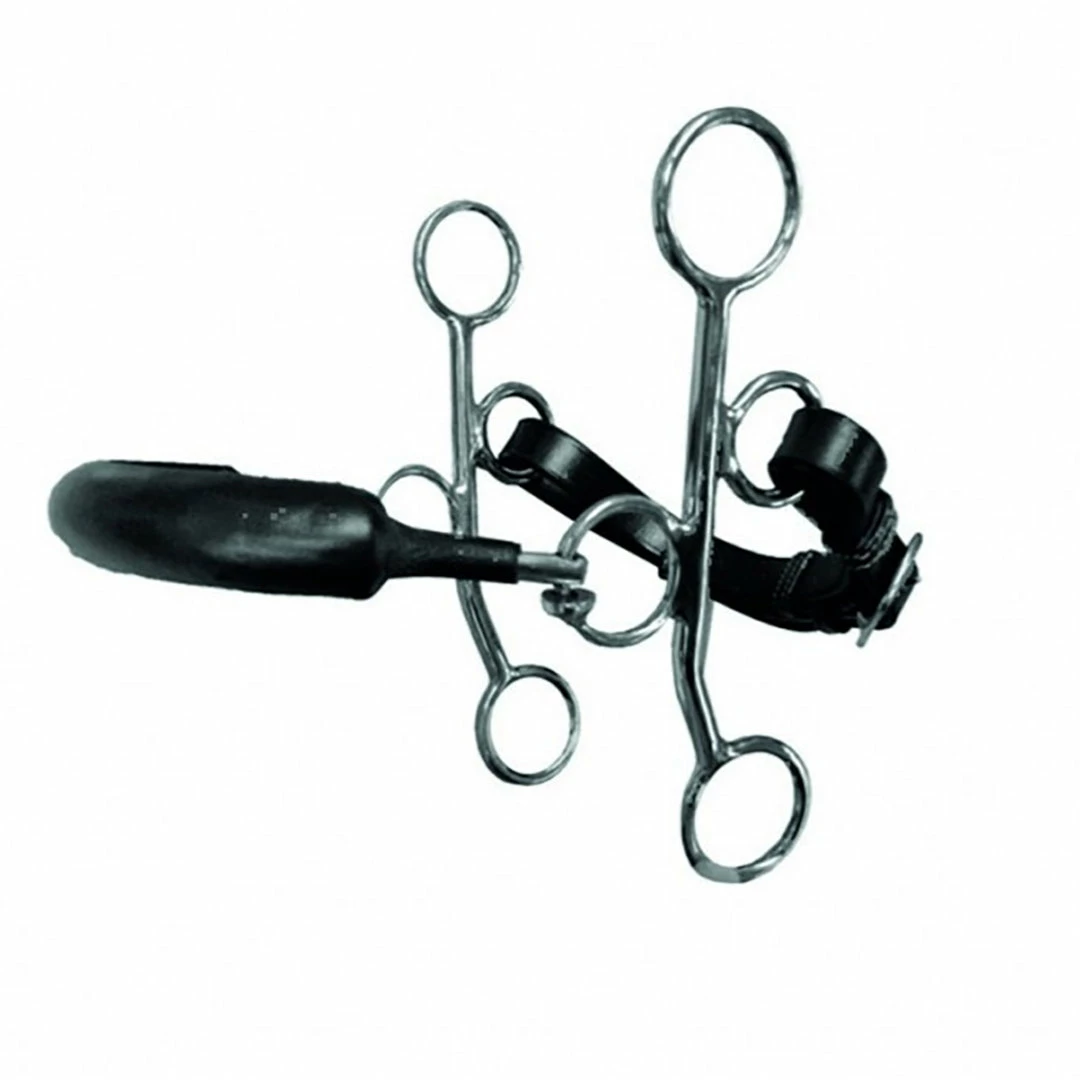 Hackamore with a rubber coated noseband, stainless steel cheeks and leather curb chain. The Hackamore has a lever action on the bridge of the nose and the mandibles only. It will not have any action on the inside of the mouth. It it great for horses that don’t tolerate bit contact in their mouth, for those that fight the rider’s hand or for those that can’t be ridden with a mouthpiece.