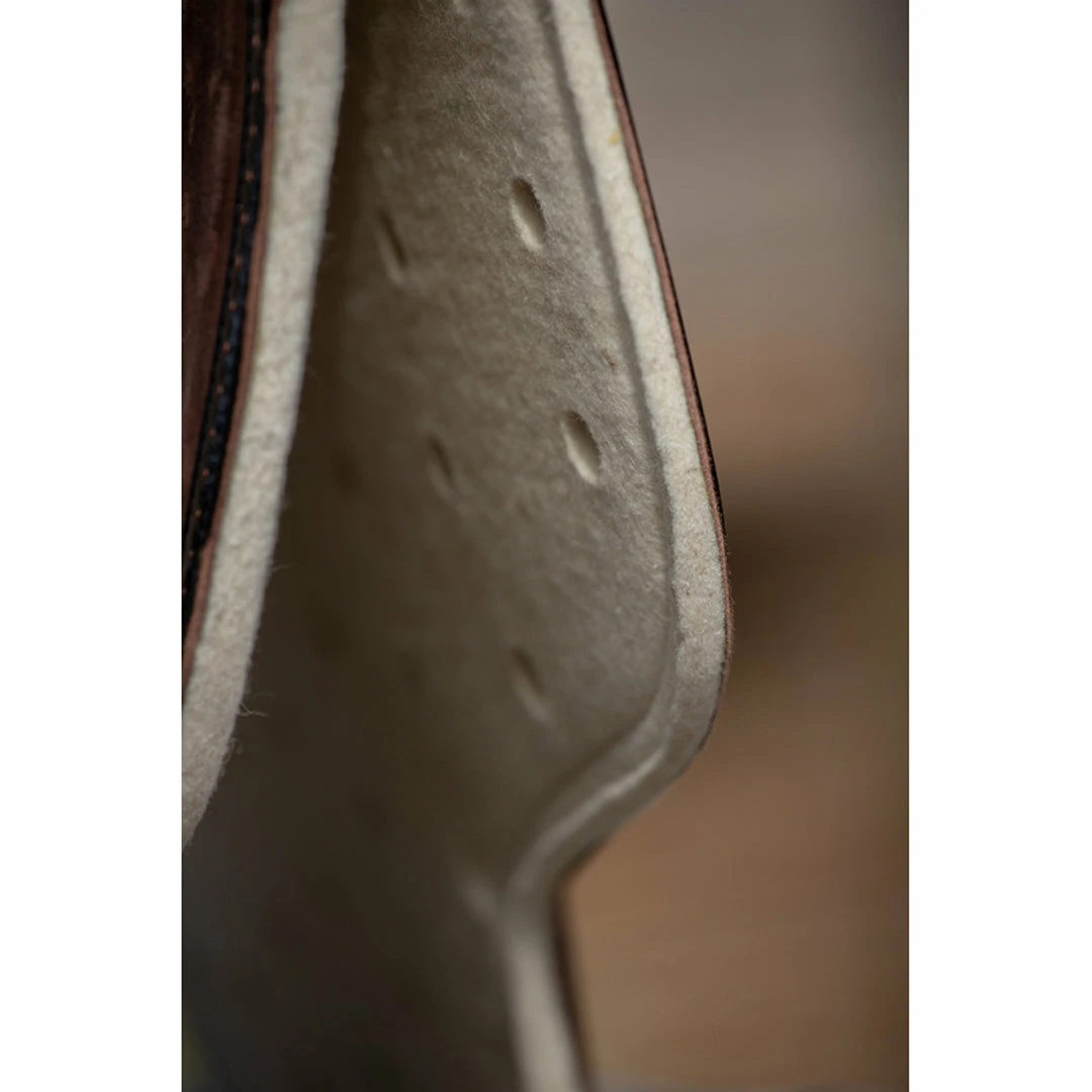 This half pad is made of three high quality fabrics : felt, shock absorbing neoprene and rough leather. The color on the outside is Havana and it comes with a black and caramel saddle stitch piping. An airy 3D mesh band on the top helps to lighten the line of the horse’s back and make it more breathable. This band allows the withers to move free and provides optimal comfort to the horse.