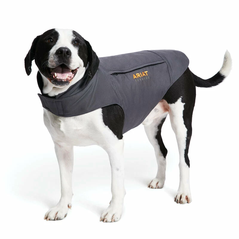 Keep your pooch warm and protected in this doggone-cute jacket cut from sturdy, flexible stretch canvas. Features a cozy quilted lining and easy on/off hook and loop straps across neck and belly.