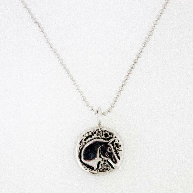 Sterling silver pendant with horse head etching on a beaded chain. Made in USA.