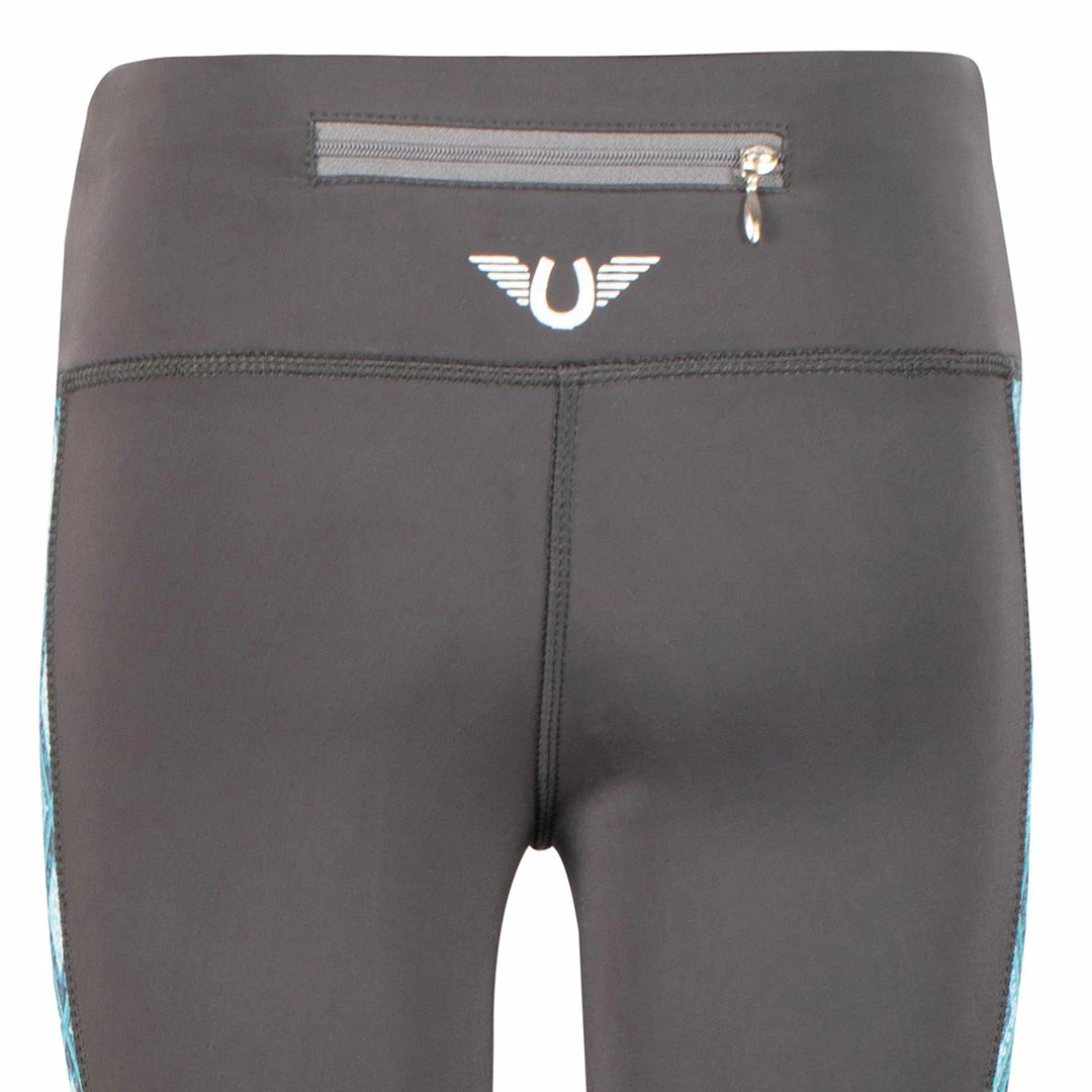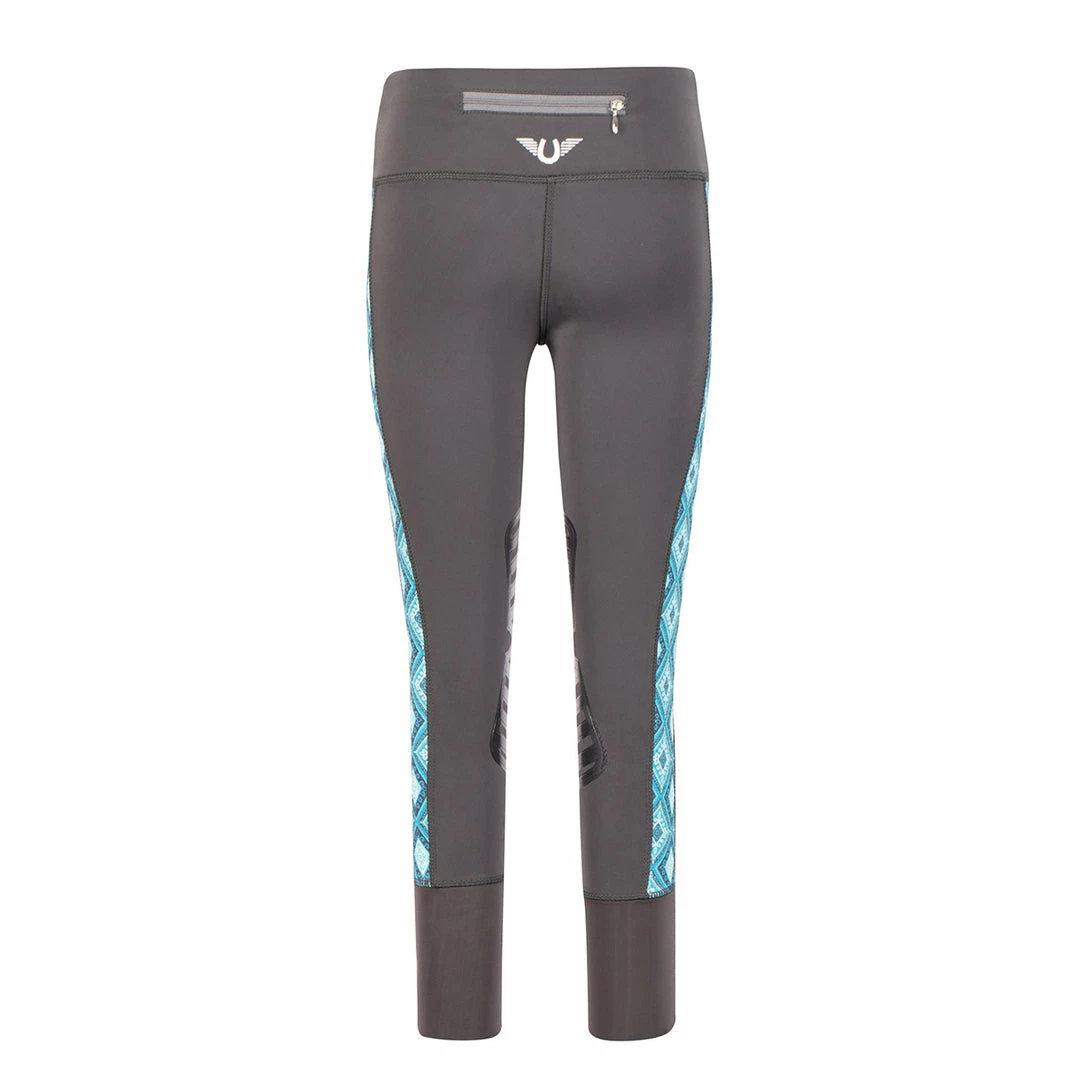 TuffRider Children’s Artemis EquiCool Riding Tights are made with a moisture-wicking technical fabric that also has a UPF 50 sun protection rating. Sure to be a favorite during the warmer months this tight is manufactured with a side strip that allows for ventilation. The side strip features a beautiful and colorful geometric pattern that is sure to make your young rider stand out from the crowd. Ideal for schooling, these pull-on tights have silicone knee patches that prevent riding up and contoured sock bottoms to suit any leg length. Also included is a new zipper back pocket on the waistband which is perfect for holding treats!