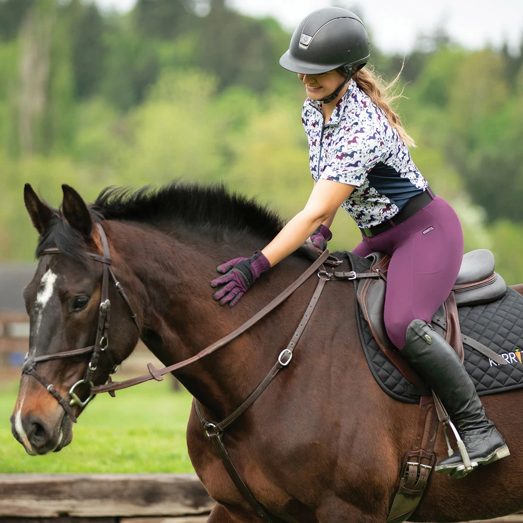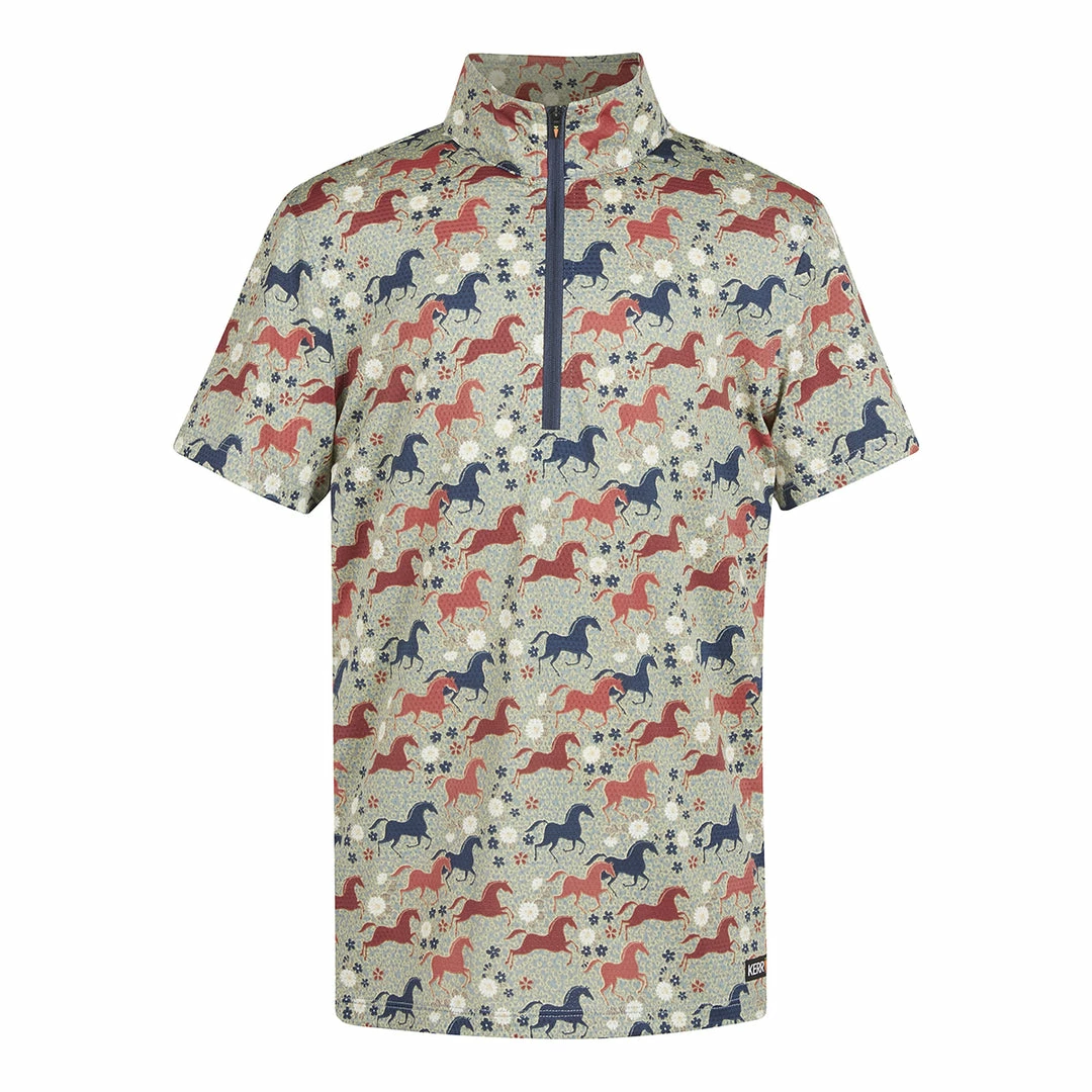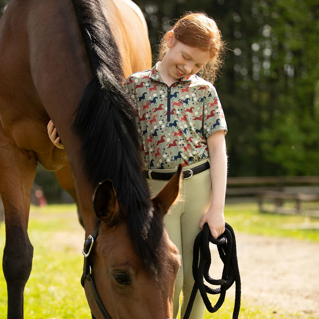 Kids will adore the fun horse and floral prints which also help hide dirt. Hi-tech Ice Fil® fabric cools their skin temperature, but never their enthusiasm for all things equine. High collar and UPF+30 sun protection blocks harmful rays. Eight-inch zip for additional ventilation.