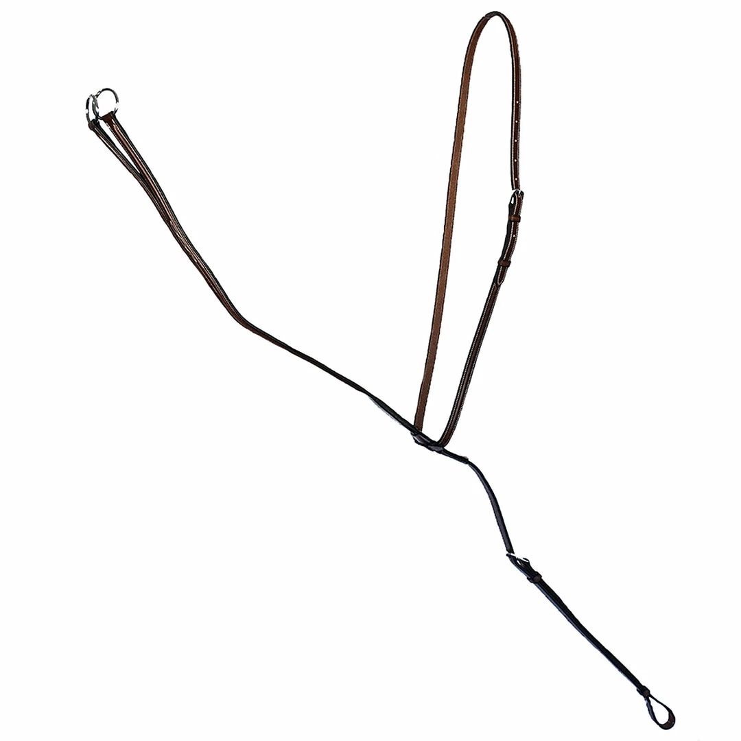 Our French leather Running Martingale beautifully matches all our jump bridles, and features a unique center connection between the neck strap and martingale strap that stabilizes the martingale and eliminates the need for a martingale stopper.