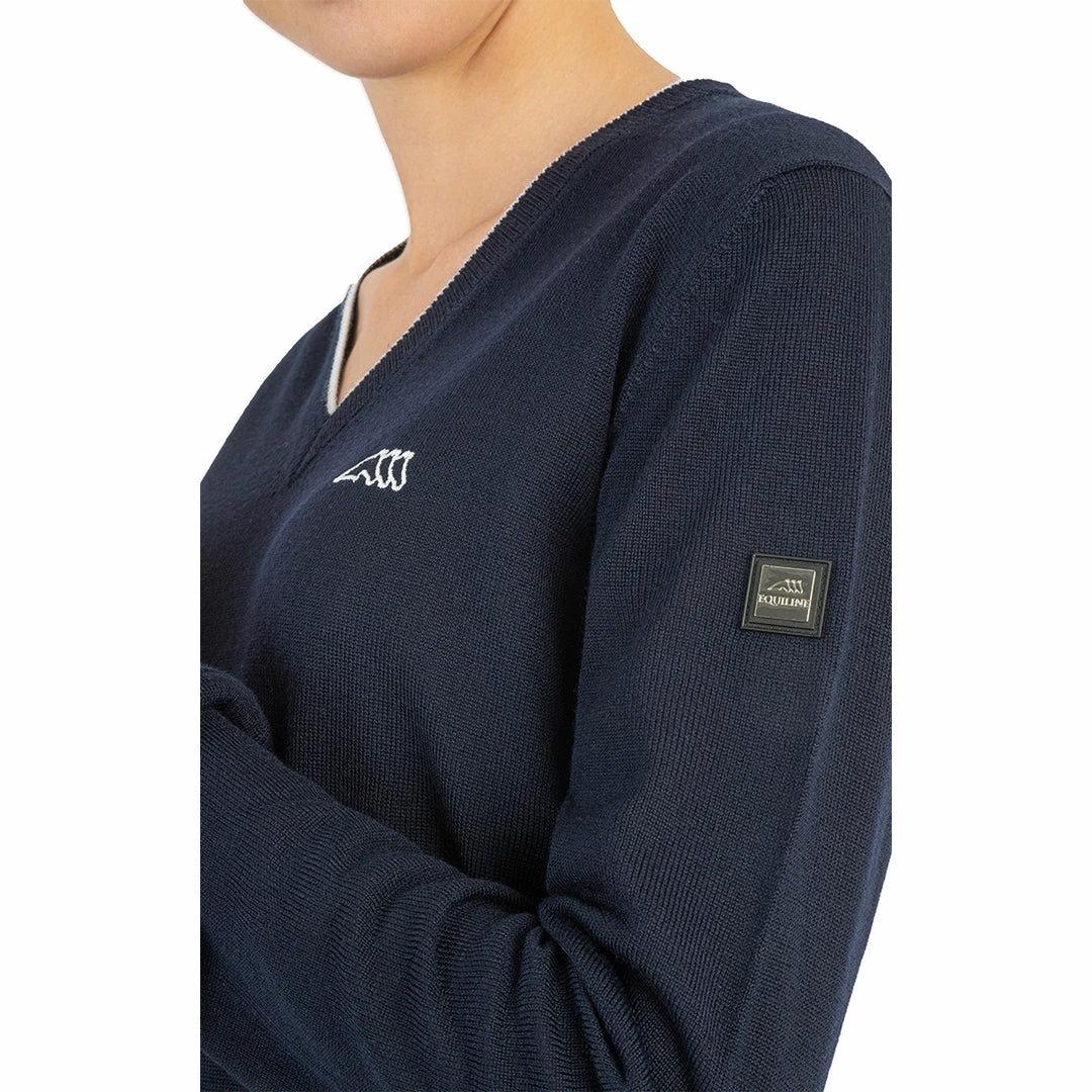This v-neck sweater comes in a lovely navy blue with a subtle cream trim along the collar. Easily pairs well with any of your favorite breeches.Â