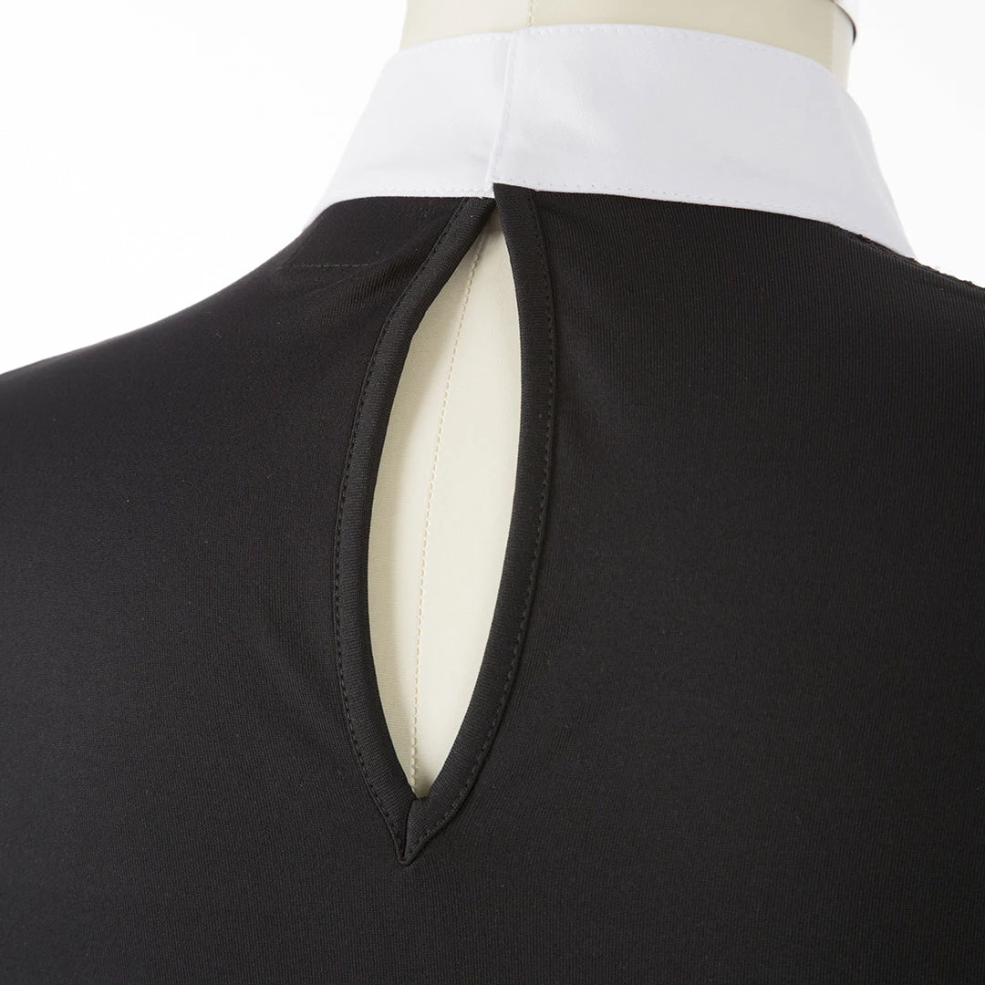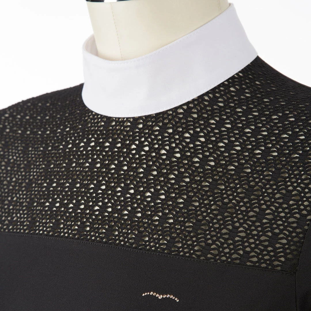 The Baxe is an elegant shirt for top level competitors. Made with high performance materials designed to wick away moisture and move with you as you ride. Features crochet front detailing, crystal Animo logo, and white collar and cuffs.