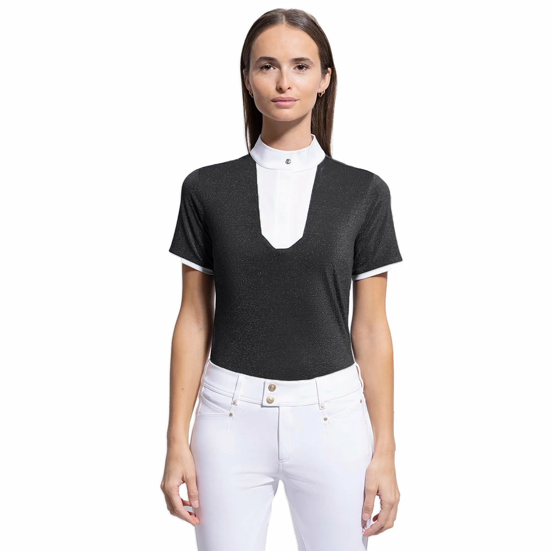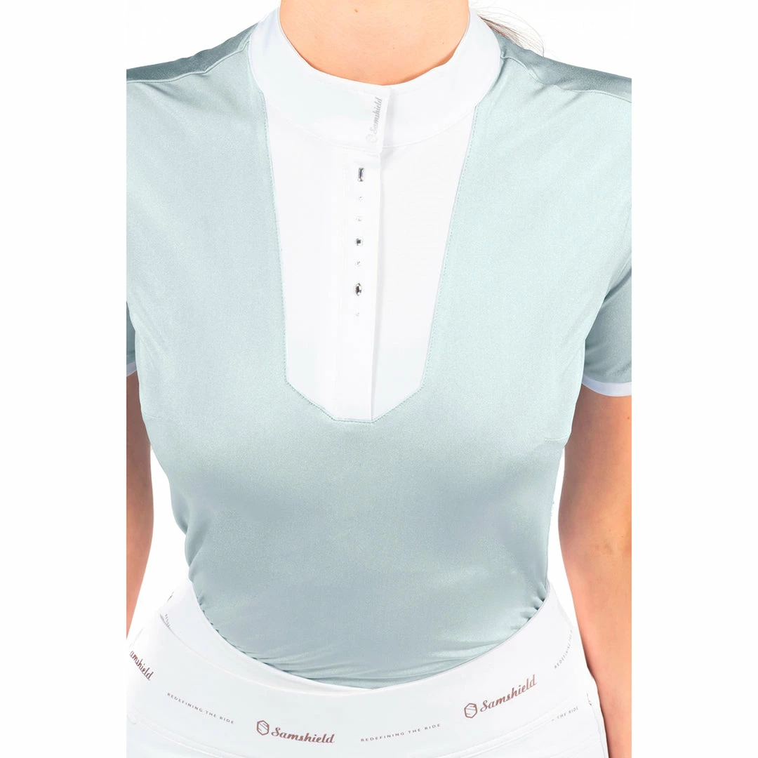 The Apollina short sleeve polo shirt is made of soft touch, highly breathable and lightweight stretch material and is very comfortable to wear. The slim fit provides excellent support and a perfect fit. The anti-UV treatment protects the skin from ultraviolet rays. The polo shirt is recognizable by its white front panel, its collar closes with invisible snaps and zip when closed. The details of the Apollina polo shirt such as the Samshield crest in Swarovski® crystals on the collar and the iridescent stripes make the Apollina a feminine, elegant and refined shirt.