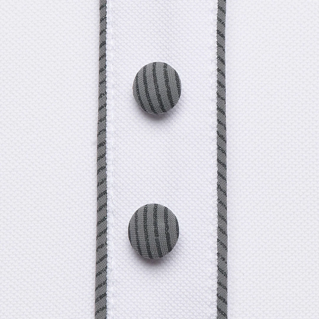 The Harper long-sleeved competition shirt is made from breathable stretch material in technical backstitch. Its tight fit ensures perfect comfort and excellent support. The collar has been festooned with a Samshield logo of metallic dots, and its braids and buttons are covered with iridescent fabric. Available in White with Grey Piping.
