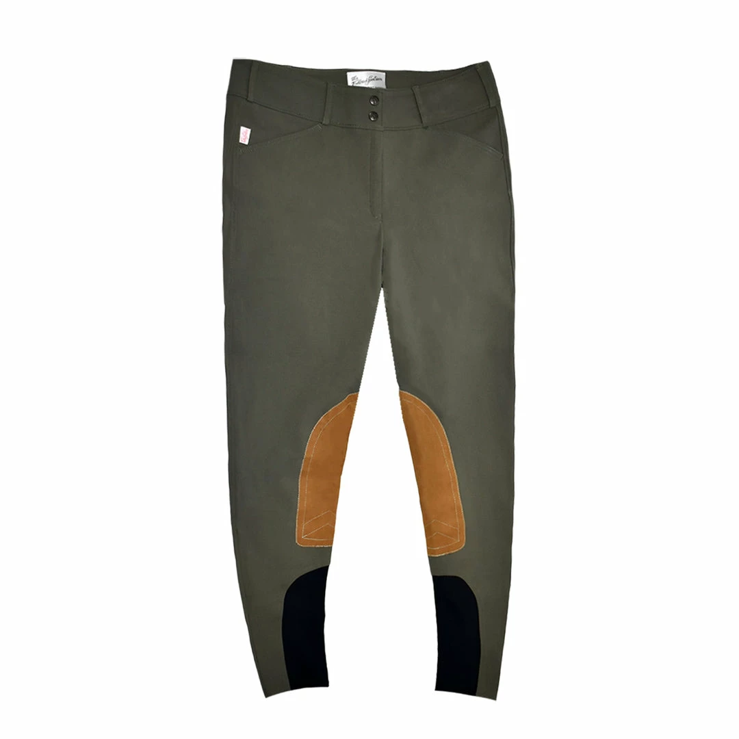 The new fabric allows for a form-fitting figure-flattering look while maintaining its shape and moving with you while you ride. Lightweight, woven 73% cotton/20% polyamide /7% Lycra, with four-way stretch for comfort. Classic European leg seams on the outside of the breech, vintage clarino knee patches, front zip, front slash pockets, and belt loops.