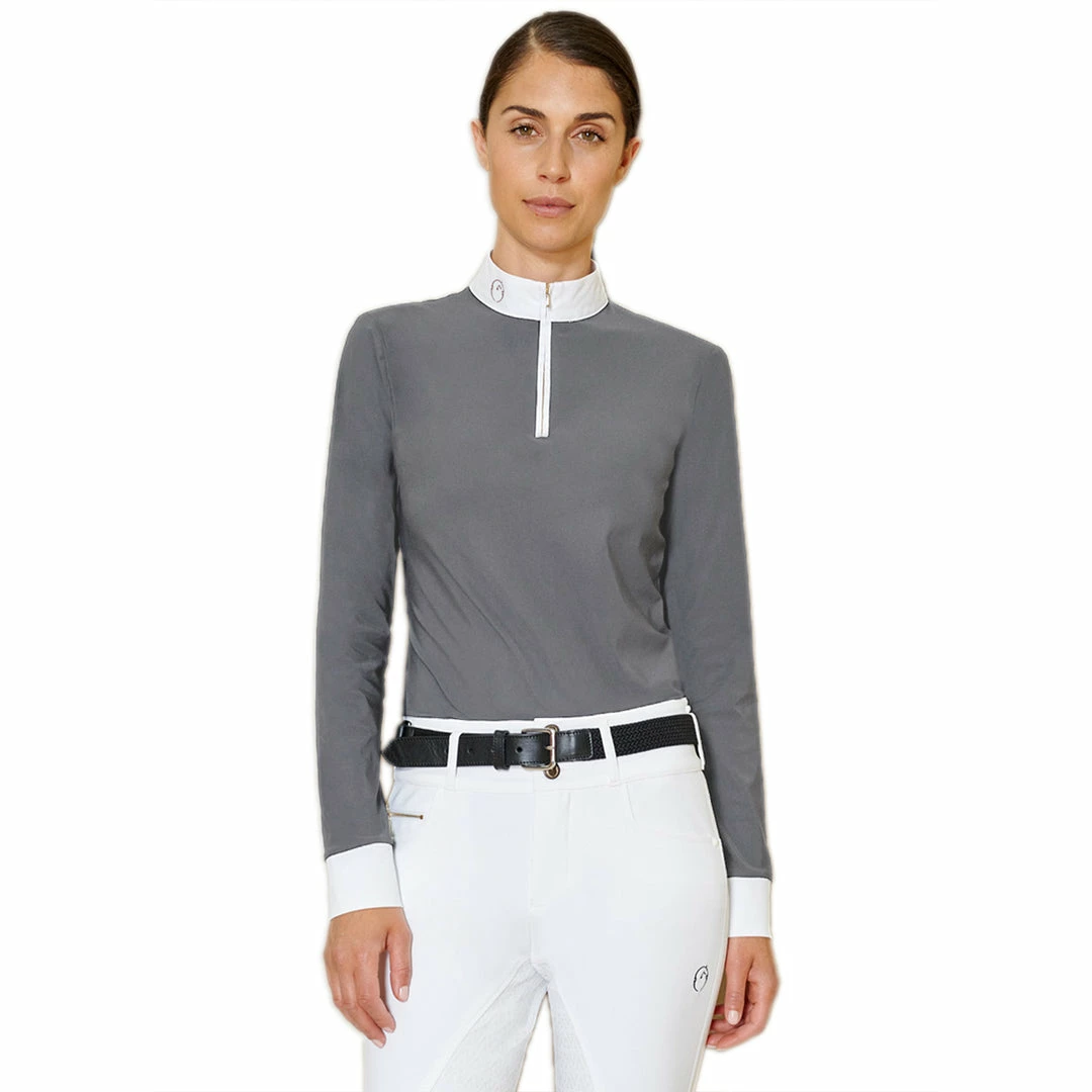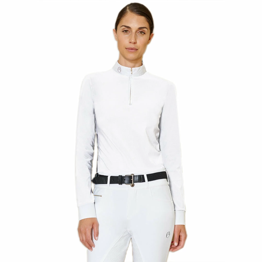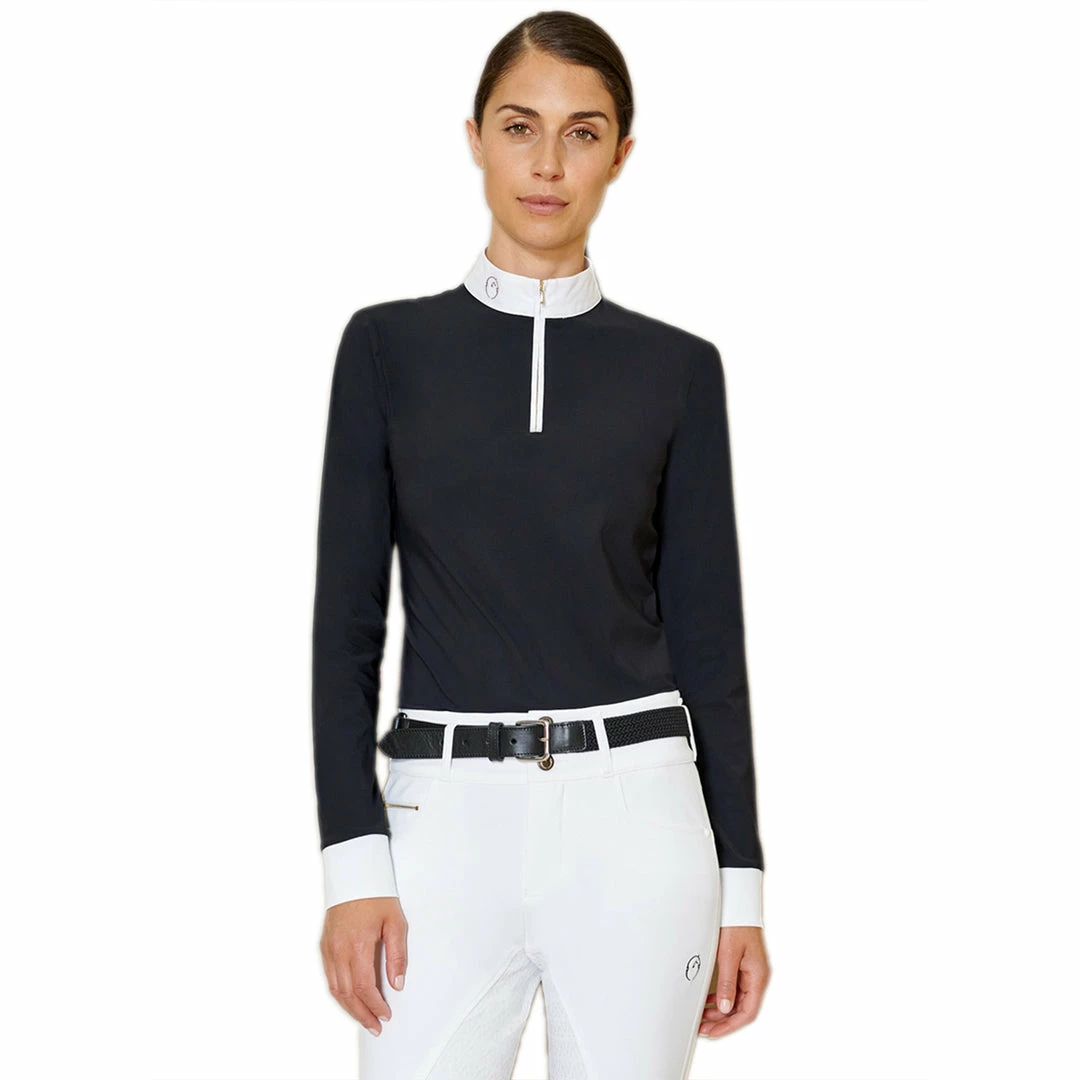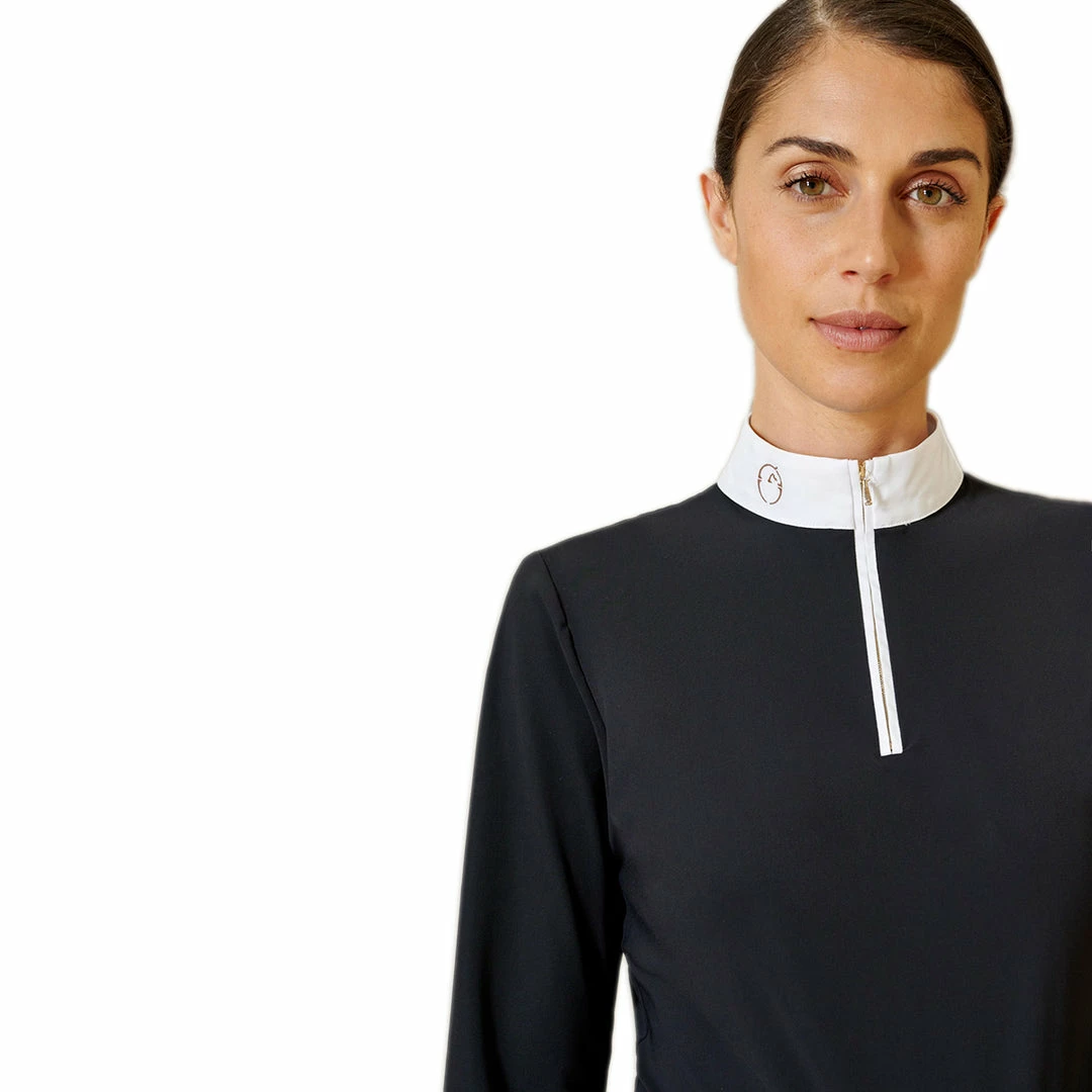 Women’s technical show shirt with front-zip embroidered collar. Designed to provide maximum comfort and breathability as a show or training top.